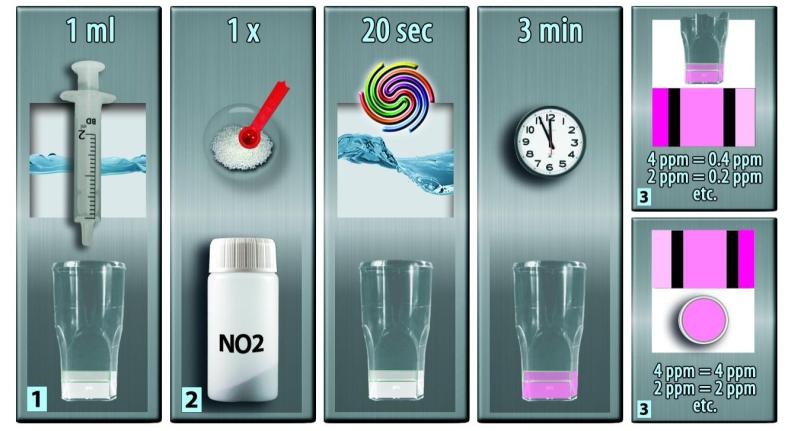 3] Coloque o frasco de teste aberto em cima de uma parte do gráfico que seja branca e compare as cores olhando de cima. Leia o conteúdo de nitrito correspondente.
