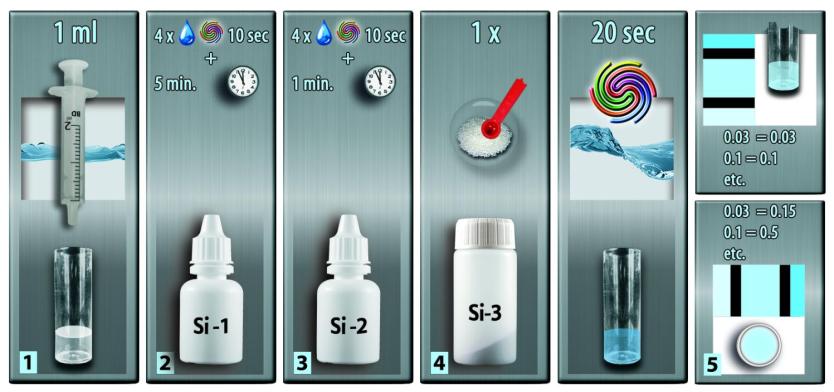 2] Adicione 4 gotas de reagente Si-1 e agite suavemente o frasco de teste por 10 segundos. Deixe repousar por 5 minutos.