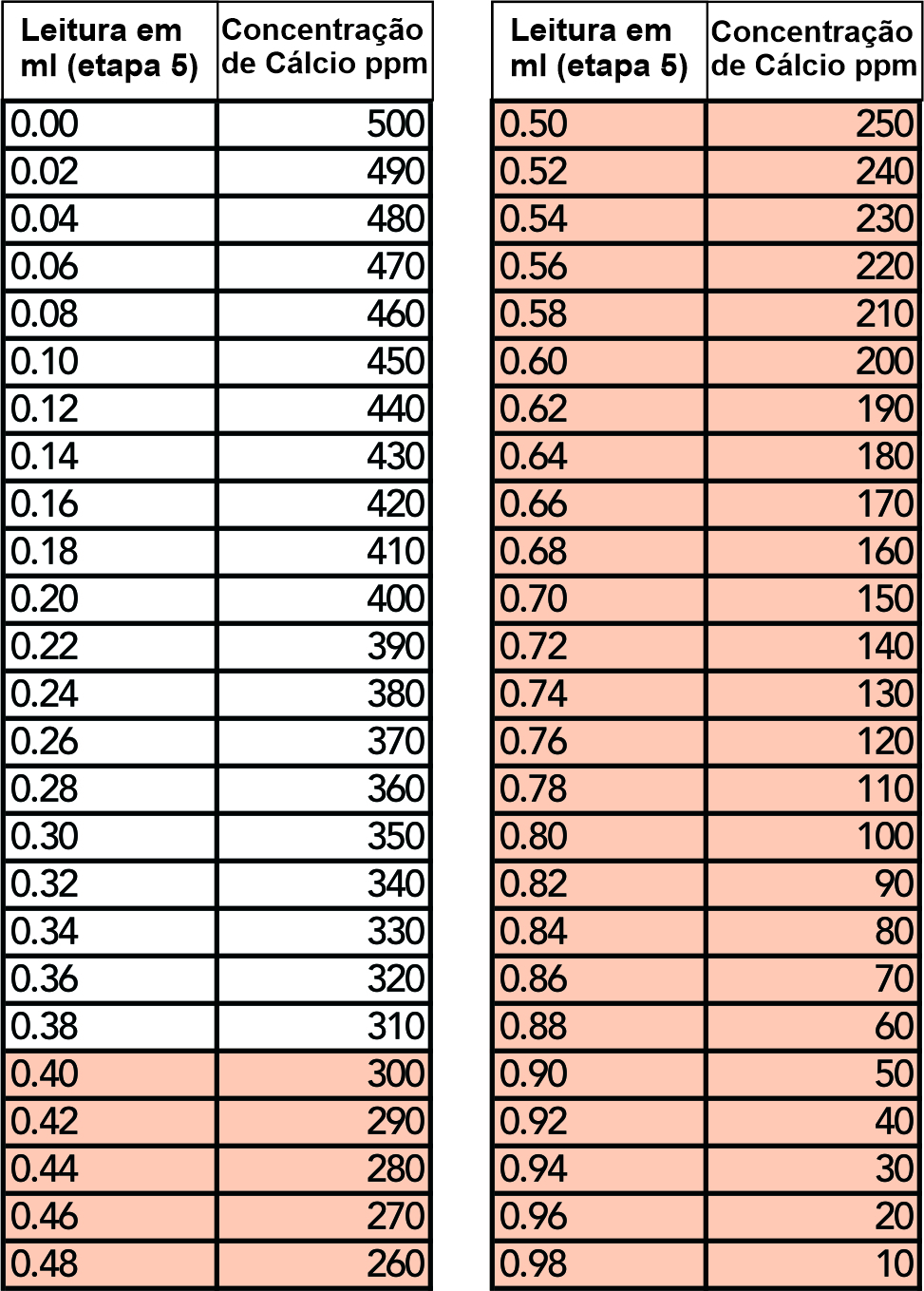 Se você escolheu o modo de resolução mais baixa, multiplique o valor de cálcio da tabela em 2.