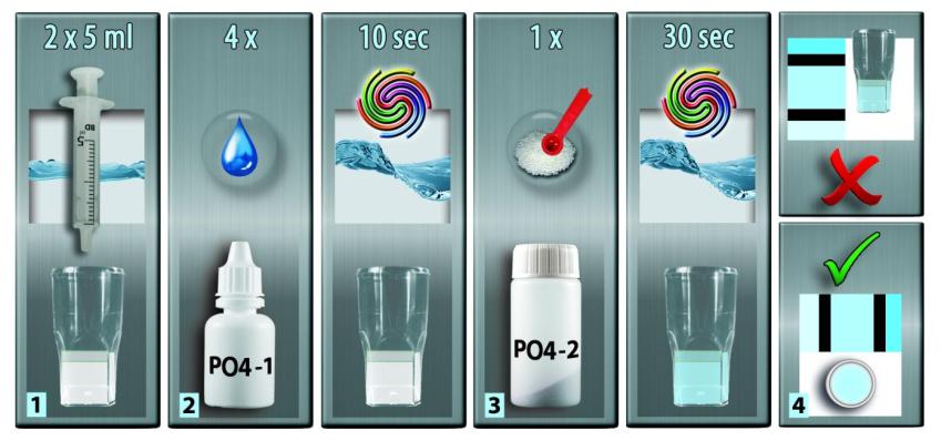 2] Adicione a isso 4 gotas de reagente PO4-1 e agite o frasco de teste suavemente por 10 segundos.