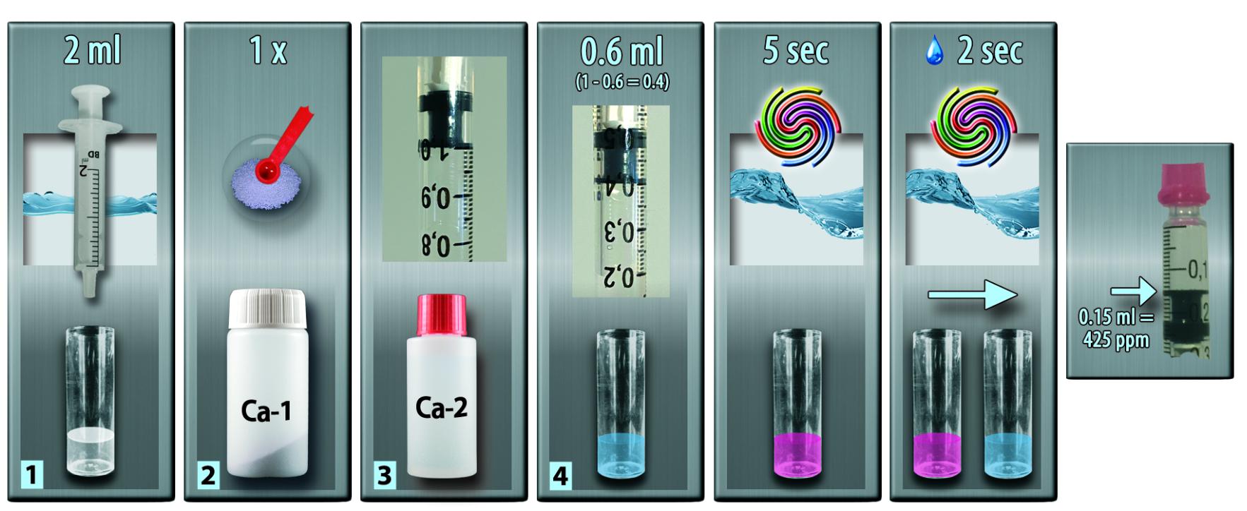 Dica: Se você souber aproximadamente a quantidade de Ca-2 necessária, então adicione até 80% disso de uma só vez (mas sempre pelo menos 0,6ml (ou 0,3ml para o modo de baixa resolução), agite por 5 segundos e depois prossiga adicionando gota a gota. Isso permitirá testes mais rápidos.