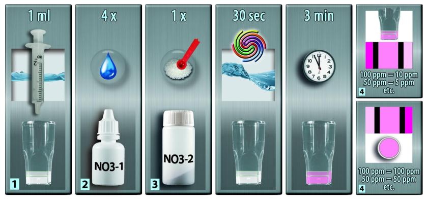 Se o valor do nitrato for inferior a 10 mg/L então você pode usar o procedimento de comparação de cores de faixa baixa. Isso vai aumentar a precisão.