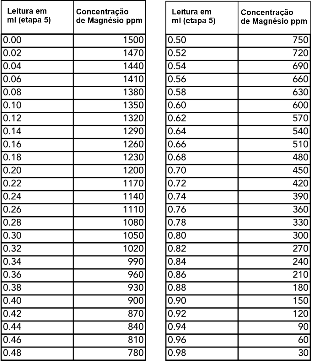 5] Segure a seringa com a ponta voltada para cima e leia a posição da extremidade superior da parte preta (pistão) da seringa. Cada divisão corresponde a 0,01ml. A concentração de magnésio pode ser obtida na tabela.