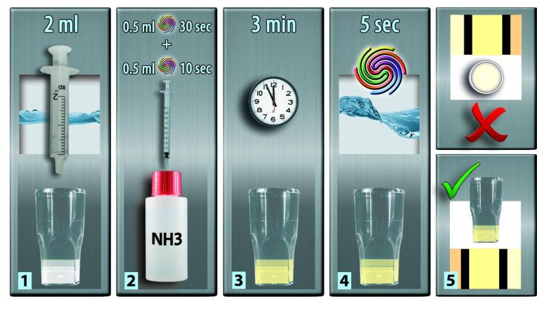 2] Encha a seringa de 1ml com 1ml de reagente Nh3. Adicione 0,5ml ao frasco de teste e agite suavemente durante 30 segundos. Adicione os 0,5ml restantes e agite suavemente por 10 segundos.